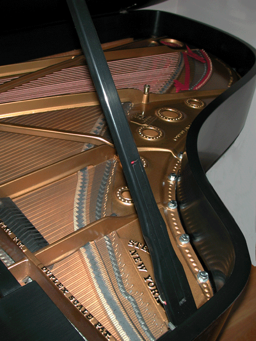 Steinway B completed 4/2004 with new board, bridges, action and ivory keys. The lid stick is custom made for this piano.